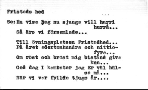 Fristads hed //// Se: la Tisa feg nu sjunga Till hurri //// hurrå*«« //// Så 8ro Ti församlade.»• //// Till öTnlngsplatsen Fristedhed... //// Om röst och bröst mig bis _ re //// kan... //// God dag I kamrater jag Ir t81 Miss må ... //// När Tl Tar fyllda tjugo år.... //// Få året adertonhundra och nittio-