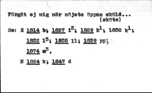 Förgät ej mig när nöjets öppne sköld, //// {sköt©) //// Set S 1814 1827 i5; 1829 k1; 1830 //// 1832 l3; 1835 11; 1839 pp* //// 1874 ¦?, //// N 1824 k*# 1847 d //// nmmmw * mmmmmmrnm
