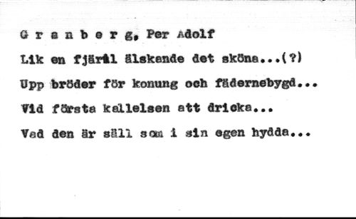 Granberg, Per Adolf Lik en f järål älskande det sköne...(?) Upp bröder för konung oeh fädernebygd. Vid första kallelsen att drleka... //// Ved den är säll som i sin egen hydda.,