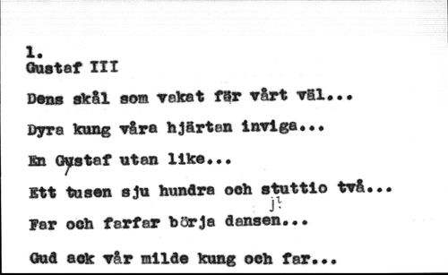 1. //// Gustaf III //// Dens sk&l som t eke t för vårt tS1. . . Dyra kung våra hjärten inviga... //// En Gustaf utan like... //// Ett tusen sju hundra och stuttlo tr&. //// j- //// Far och Farfar börja dansen.•• //// Gud aok vår rallde kung och far...