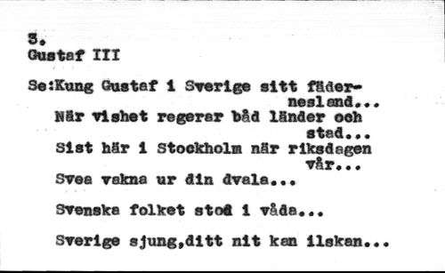 3« //// Gustaf III //// Se:Kung Gustaf 1 Sverige sitt fädernesland. •• //// Här vishet regerar håd länder oeh //// stad« * « //// Sist här i Stockholm när riksdagen //// ?Sr«•• //// Svea vakna ur din dvals... //// Svenske folket stot 1 våda«.. //// Sverige sjung,ditt nit kan ilskan.••