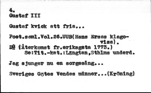 4. //// Gustaf III //// Gustaf kvick att fria,,. //// Post.saral.Vol*26.UUB(Hans Kraaa klago- //// visa). //// DÖ (Återkomst fr.eriksgata 1773.) //// Se: Tit .-kat.: Långt an ,Sthlms underd. //// Jag sjunger nu en sorgesång... //// Sveriges Gates Vendes männer...(Kröning)
