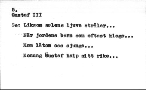 5. //// Qustaf III //// Se: Likson a®lens Ijura strålar... //// Når jordens barn som oftast klaga. Kota låtan oss sjunga... //// Konung Öustaf halp sitt rike...