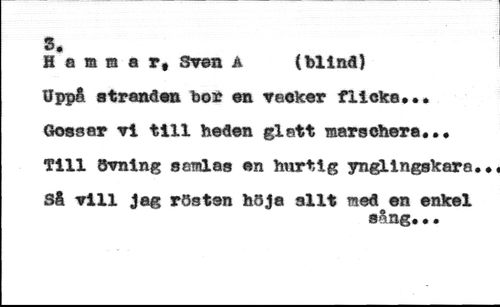 SK CA //// (blind) //// * //// ammar, Sven a //// Öppå stranden bon en vaoker flicka... //// Gossar vi till heden glatt marschera... //// Till övning samlas en hurtig ynglingskara //// Så vill jag rösten höja allt med en enkel //// sång..«
