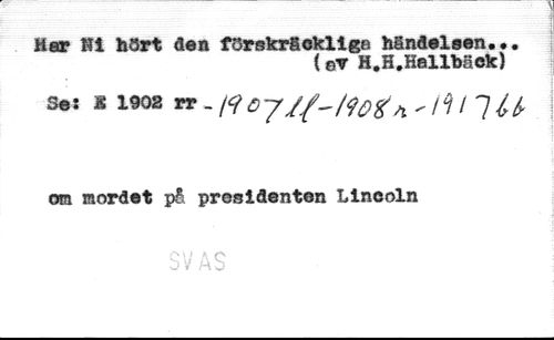 Har Hi //// Se: 1 //// hart aen farekräeklige händelsen... //// (ev H.H,Hallbäck) //// 1908 rr . l<?ey//-/fog'n -lU^U //// om mordet på presidenten Lincoln