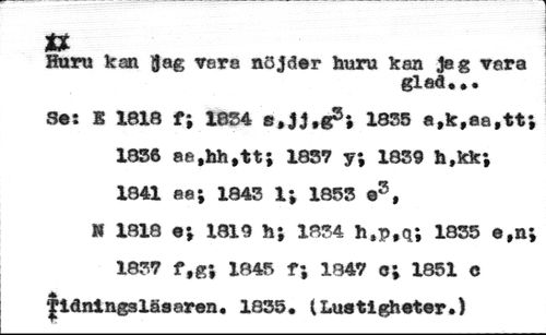 Huru kan gag rera nöjder huru kan jag vara //// glad... //// Se: K 1818 f; 1854 s.jjtg3; 1835 a,k,aa,tt //// 1836 ae.hh.tt; 1837 y; 1839 h,kk; //// 1841 aa; 1843 1; 1853 e3, //// H 1818 e; 1819 h; 1834 h.p.q; 1835 e,n; //// 1837 f,g; 1845 f; 1847 c; 1851 c Jidningaläsaren. 1835. (Lustigheter.) //// W