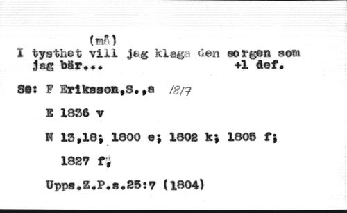 I tysthet vill jeg klaga öen sorgen som Jag bär««« +1 def. //// 8«: F Eriksson,3. ,a /#/? //// K 1836 v //// N 13,18; 1800 e; 1802 k; 1805 f 1827 ti //// Upps.Z«P.a.25:7 (1804)