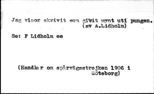 Jag visor skrivit som giirit mvnt uti pungen, //// i av A.Lidholm) //// Se: F Lidholrn ee //// (Handk- r om ep&rvägsstre jken 1906 i //// Göteborg)