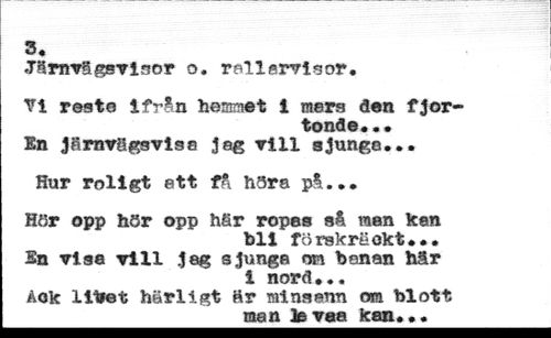3. //// JänrrägsTrlsor o, rall«rrlsor. //// Vi reste ifrån hemmet i mers den fjortonde« • • //// En Järnvägsvise jag Till sjung©... //// Hur roligt ett få höra på... //// Hör opp hör opp här ropes så men kan //// bli förskräckt... //// En visa vill jag sjunga om benan här //// i nord... //// åok llbet härligt är minsann om blott //// man te vaa kan...