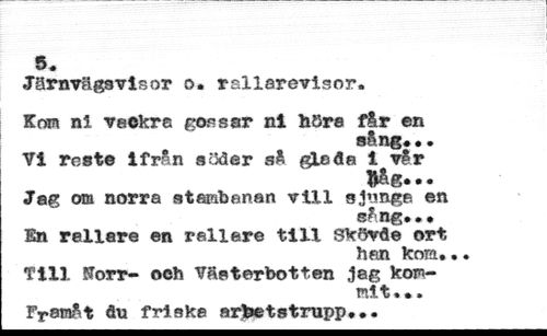 5. //// Järnvägsvisor o* rsllarevisor. //// Kom ni vackra gossar nl höra får en //// sång*•. //// Vi reste ifrån söder så gleda i rår //// #åg... //// Jag om norra stambanan vill sjnnge en //// sång* • 0 //// En rallare en rallare till Skövde ort //// han kom. •. //// Till !forr- och Västerbotten jag kom- //// r1t»* » //// Framåt du friska arbetstrupp...