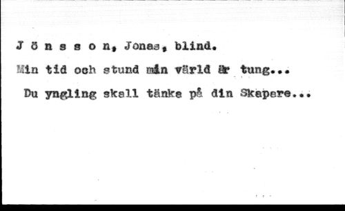 Jönsson, Jonea, blind« //// Min tid oeh stund min värld är tung.«. Du yngling skall tänka på din Skapere.