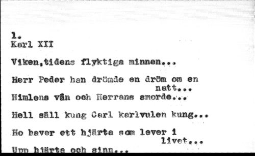 1. //// Karl XII //// Viken.tiaens flyktiga minnen.., //// Herr Peder han drömde en dröm oro en //// natt«*. //// Himlens vSn oeh Herrans smorde... //// Hell sfill kung Carl karlrwlen kung..# //// Ho bever ett hjflrte a o» leyer i //// livet,,• //// Um MUrta ooh sinn...