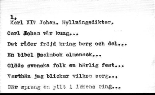 1. //// Kerl XIV Johan. Hyllningsdikter. //// Carl lohen vor kung... //// Det råder fröjd kring berg och dal.»« In bibel Paalnbok almanack.•• //// Gläds svenska folk en härlig fest... Varthän jag blickar vilken sorg#»» Där spreng en pilt i lekens ring.»#
