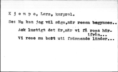 K J b m p ©, Lars» korpral* //// Se: No kan Jag väl a£gafnär resan begynnas,« //// Aok lustigt, art är,når vl få resa här- //// ifrån... //// VI rese nu bort uti främmande länder.••