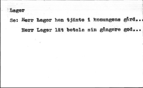 Lsger //// Se: Herr lager han tjänte 1 Konungens g&rd..< Herr Lager lät betala sin gångsre god...