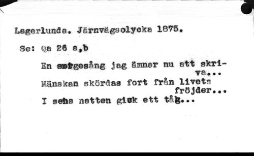Lagerlunda. Järnvägsolycka 1875, //// Se: Qa 2ft s#b //// En «sfcgesång jag ämnar nu ett skri //// ve... //// Mänskan skördas fort från livets //// fröjder.. //// I seil a natten gick ett tåfe...