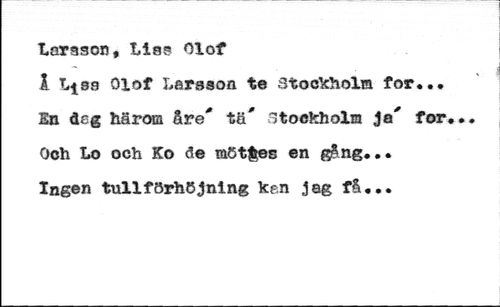 Larason, Lias Olof //// 1 1*98 Olof Larsson te Stockholm for... En deg härom åre'' tö' Stockholm Ja'' for. Och Lo och Ko de möttes en gång... //// Ingen tullförhöjning kan jag få...