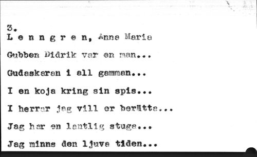 1$ //// m //// e n n g r e n, Anne Mario Gubhen i>idrik var en nan*.. Gudaskaran i all gamnan... //// I en koja kring sin spis... //// I herrar jag vill er berltte... Jag har en lantlig stuga... //// Jag ralnns den ljuve tiden...