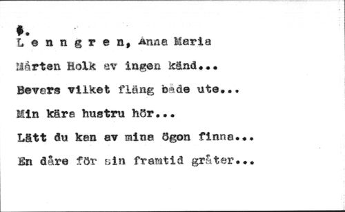 Lenngren, *nna Maria Mårten Holk av ingen känd... Bevers vilket fläng b°ide ute.. Min kära hustru hör... //// Lätt du kan av mina ögon finna En dåre för kin framtid gråter