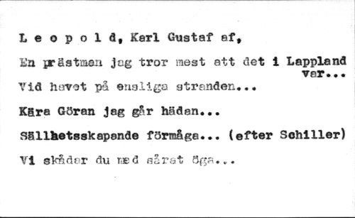Leopold, Karl Gustaf af, //// Ku prästman jag tror mest att det 1 Lappland //// var»,* //// Yid havot på ensliga stranden,.. //// K&ra Göran jag g*r hödan... //// S§llhetsskapande förmåga... (efter Sehlller) //// 'Vi sVådor du raed sårst öga..
