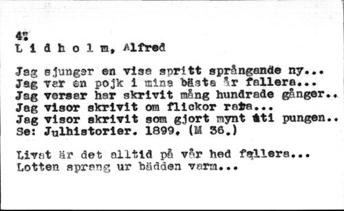 « //// t i d h o 1 a, Alfred //// Jag sjungar en visa spritt språngande ny... Jag ver m pojk i mina bästa år fallera... Jag verser har skrivit raång hundrade gånger Jag visor skrivit om flickor rata... //// Jag visor skrivit som giort mynt *ti pungen Se: Julhistorier. 1899. (M 36.) //// Livat är det alltid på vår hed fallera..• Lotten sprang ur bädden varm..•