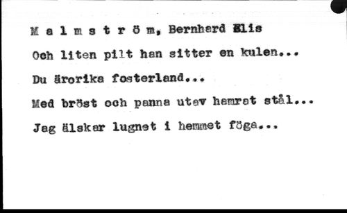 Malmström, Bernhard Bils Ooh liten plit han sitter en kulen.. Du ärorika fosterland... //// Med hröst ooh panna utsr hamrat stål Jag älskar lugnet 1 hemmet föga...