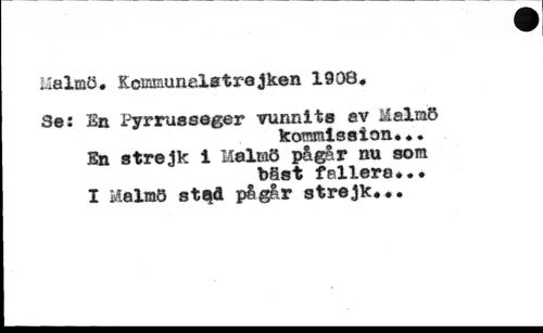 Malmö. Komniunelatrajken 19®. //// Se: En Pyrruaseger vunnits ev Malmö //// kommission*?. En strejk i Malmö pågår nu som //// bäst fallera... //// I Malmö stQå pågår strejk...