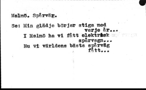 Malmö. Spårväg. //// Se: Min glädje börjer stige med //// verje år.. //// I Malmö ha vi fått elektrisk //// sparvagn... Ku vi världens bäste spårväg //// fått...