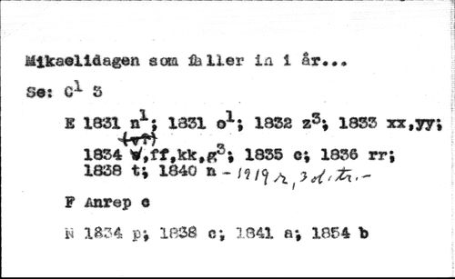 Mikaelidagen scxa feller in i år..* //// Se: G1 5 //// E 1831 n1: 1331 o1; 1832 z3*, 1833 xx.yy; //// 1834 V.ff.kk.g3*, 1835 c; 1836 rr; //// 1838 ti 1840 n-/î/ÎA //// F nnrep e //// Ü 1234 pi 1838 c; 1341 a*# 1854 b