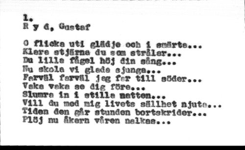 u //// Hy i, öastaf //// 0 fl t oks Uti ?1M Je och i safirte... Kl*** st jffme du aöa strålar» •• //// Da 1111« fågel höj dia sång*.. //// Ha skola vt gleds sjunga... //// Farvfil farvfil Jag trT tlU söder... //// Veke vaka as dig röre... //// sitaara ia t stilla natten. • • //// till du med alg livets sHllhet njuta... //// liden den går stunden bortafcrlder..• //// Plöj nu åkern våren nalkas.••