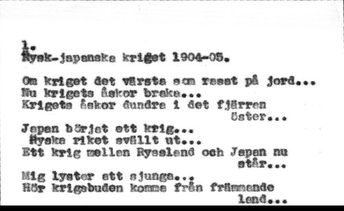 Japanske krigst 1904-05. //// 0® kriget det sSrsta sas xeeat på Jord*«* B« krigets åskor brak*,,. //// Krigets åskor dundre i det fjarre® //// Oster* * * //// Japan b Or Jet ©tt krig*,* //// Hyska riket avflllt nt... //// Ett krig rseilan Ryaalend oeh Japan na //// atår... //// Mig lyster ett slunga*., //// H5r krigsbuden korsets från frarrmnd© //// lend***