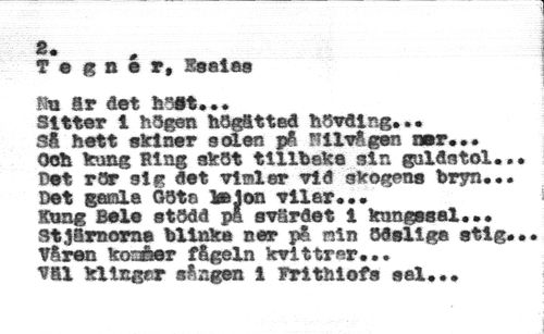 T e g n e r, Esaias //// rn 3r det hö#t... //// Sitter 1 högen högättad hövding... //// Så hett skiner solen på Hilvågen O Ooh kung Ring sköt tillhaka sin gul Astol... Det rör sig det vimlar vid skogens bryn... Det gamla Göta telon vilar.•• //// Kung Sele stödd på svärdet i kungssal.•• Stjärnorna blinka ner på min ödsliga stig... Våren kooåer fågeln kvittrar... vai klingar sångsa 1 Fritfelofs sel...