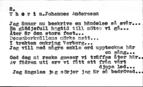 2. //// T h o r l n.Johennes Andersson //// Jeg äraner m beskriv© ©q händelse sfi svår... //// ?n glädjefull h*gtid tiil ®3ten vi gå... //// ter ir den ator© fest... //// DecesberkvSl lens cärka natt,,. //// I trakten onkring Verberg... //// Jag vill ned någre enkla ord uppteckna här //// en sång* •* //// God dag ni raska gossar vi träffas åter h^r.« Av fädren uti arv vl fltt ett från vårt //// djupa led,., //// Jag ängslas jag s dr jer jag är så bedröved...