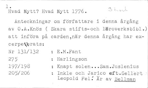 1. //// Hvad Nytt? Hvad Nytt 1776. //// Anteckningar om författare i denna årgång av O.A.Knös ( Skara stifts-och läroverksbib1.)I att införa på cardenlnär denna årgång har excerperats: //// Nr 131/132 : E.M.Fant //// 275 Harlingson //// 197/198 : Knapt solen...Sam.Juslenius //// 205/206 Inkle och Jarico eft.Le11ert //// Leopold Fel: Är av Bellman
