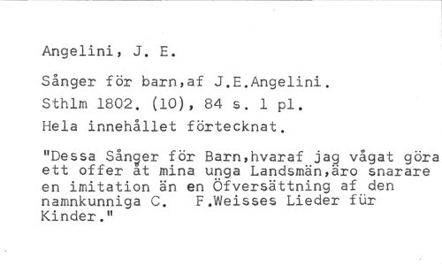 Angelini, J. E. //// Sånger för barn,af J.E.Angelini. Sthlm 1802. (10), 84 s. 1 pl. Hela innehållet förtecknat. //// "Dessa Sånger för Barn,hvaraf jag vågat göra ett offer at mina unga Landsmän,äro snarare en imitation än en Ofversättning af den //// namnkunniga C. F.Weisses Lieder ftir //// Kinder."