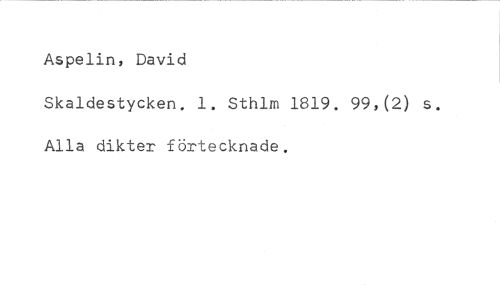 Aspelin, David //// Skaldestycken, 1. Sthlm 1819. 99,(2) s. Alla dikter förtecknade.