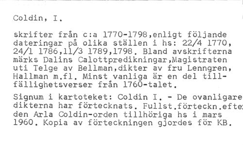 Coldin, I. //// skrifter från c:a 1770-1798,enligt följande dateringar på olika ställen i hs: 22/4 1770, 24/1 1786,11/3 1789,1798. Bland avskrifterna märks Dalins Calottpredikningar,Magistraten uti Telge av Bellman,dikter av fru Lenngren, Hallman m.fl. Minst vanliga är en del tillfällighetsverser från 1760-talet. //// Signum i kartoteket: Coldin I. - De ovanligare dikterna har förtecknats. Fullst.förteckn.efte: den Arla Coldin-orden tillhöriga hs i mars 1960. Kopia av förteckningen gjordes för KB.