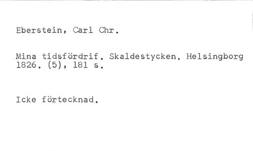 Eberstein, Carl Chr. //// Mina tidsfördrif. Skaldestycken. Helsingborg 1826. (5), 181 s. //// Icke förtecknad.