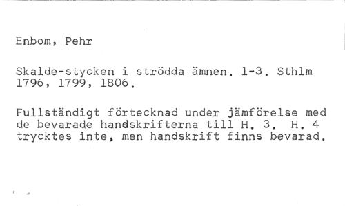 Enbom, Pehr //// Skalde-stycken i strödda ämnen. 1-3. Sthlm 1796, 1799, 1806. //// Fullständigt förtecknad under jämförelse med de bevarade handskrifterna till H. 3. H. 4 trycktes inte, men handskrift finns bevarad.