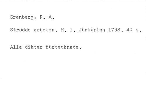 Granberg, P. A. //// Strödde arbeten. H. 1. Jönköping 1798. 40 s. //// Alla dikter förtecknade.