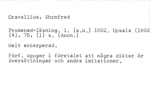 Gravallius, Ehrnfred //// Promenad-läsning. 1. (a. (4), 75, (1) s. (Anon.) 1802. Upsala (1802 //// Helt excerperad. //// Förf, uppger i företalet att några dikter är översättningar och andra imitationer.
