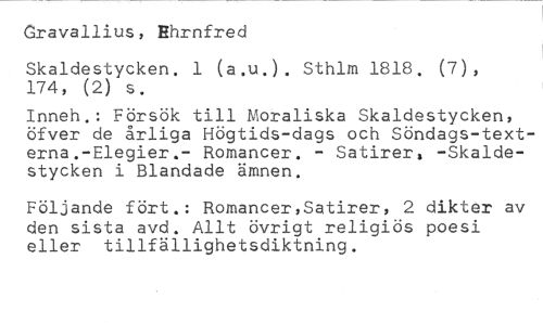 Gravallius, Ehrnfred //// Skaldestycken. 1 (a.u.). Sthlm 1818. (7), 174, (2) s. //// Inneh.: Försök till Moraliska Skaldestycken, öfver de årliga Högtids-dags och Söndags-texterna.-Elegier.- Romancer. - Satirer, -Skaldestycken i Blandade ämnen. //// Följande fört.: Romancer,Satirer, 2 dikter av den sista avd. Allt övrigt religiös poesi eller tillfällighetsdiktning.