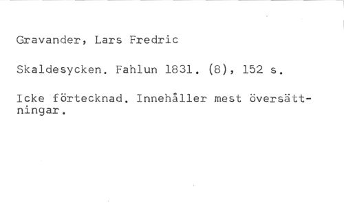 Gravander, Lars Fredric //// Skaldesycken. Fahlun 1831. (8), 152 s. //// Icke förtecknad. Innehåller mest översättningar.