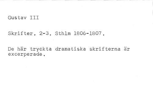 Gustav III //// Skrifter. 2-3. Sthlm 1806-1807. //// De här tryckta dramatiska skrifterna är excerperade.