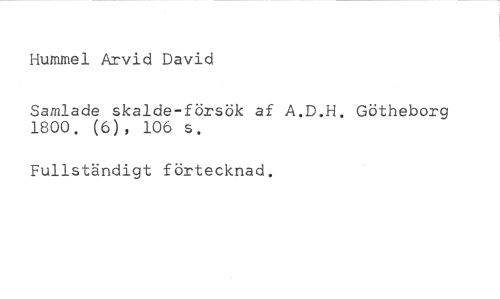 Hummel Arvid David //// Samlade skalde-försök af A.D.H. Götheborg 1800. (6), 106 s. //// Fullständigt förtecknad.