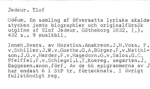 Jedeur, tlof //// °deum. En samling af öfversatta lyriska skalde stycken jemte biographier och originalförsök utgifne af Elof Jedeur. Götheborg 1832. (j, 432 s., 9 musikbil. //// Inneh.övers. av Horatius,Anakreon,J.H.Voss, F. v.Schiller,J.W.v.Goethe,G.A.BUrger,F.v.Matthison,J.G.v.Herder,F.v.Hagedorn,G.v.Salos,G.C. Pfeiffel,F.v.Schlegel,L.T.Koereg. segarten,J. Baggesen,anon.förf. Av de 66 epigrammerna av J har endast 6 i StP tr. förtecknats. I övrigt fullständigt reg.