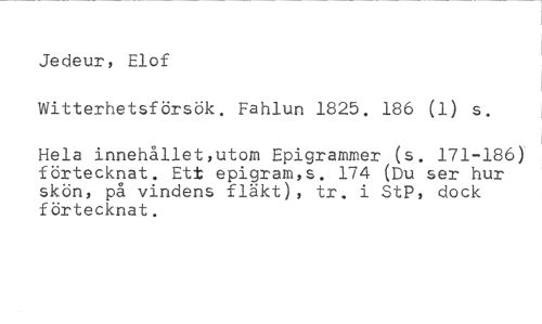 Jedeur, Elof //// Witterhetsförsök. Fahlun 1825. 186 (1) s. //// Hela innehållet,utom Epigrameter (s. 171-186) förtecknat. Ett epigram,s. 174 (Du ser hur skön, på vindens fläkt), tr. i StP, dock förtecknat.