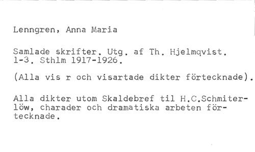 Lenngren, Anna Maria //// Samlade skrifter. Utg. af Th. Hjelmqvist. 1-3. Sthlm 1917-1926. //// (Alla vis r och visartade dikter förtecknade). //// Alla dikter utom Skaldebref til H.C.Schmiterlöw, charader och dramatiska arbeten förtecknade.