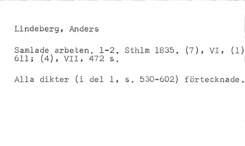 Lindeberg, Anders //// Samlade arbeten. 1-2. Sthlm 1835. (7), VI, (1) 611; (4), VII, 472 s. //// Alla dikter (i del 1, s. 530-602) förtecknade.