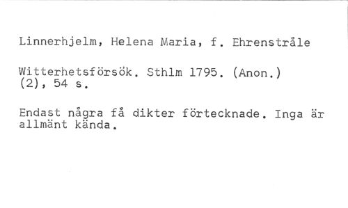 Linnerhielm, Helena Maria, f. Ehrenstråle //// Witterhetsförsök. Sthlm 1795. (Anon.) (2), 54 s. //// Endast några få dikter förtecknade. Inga är allmänt kända.